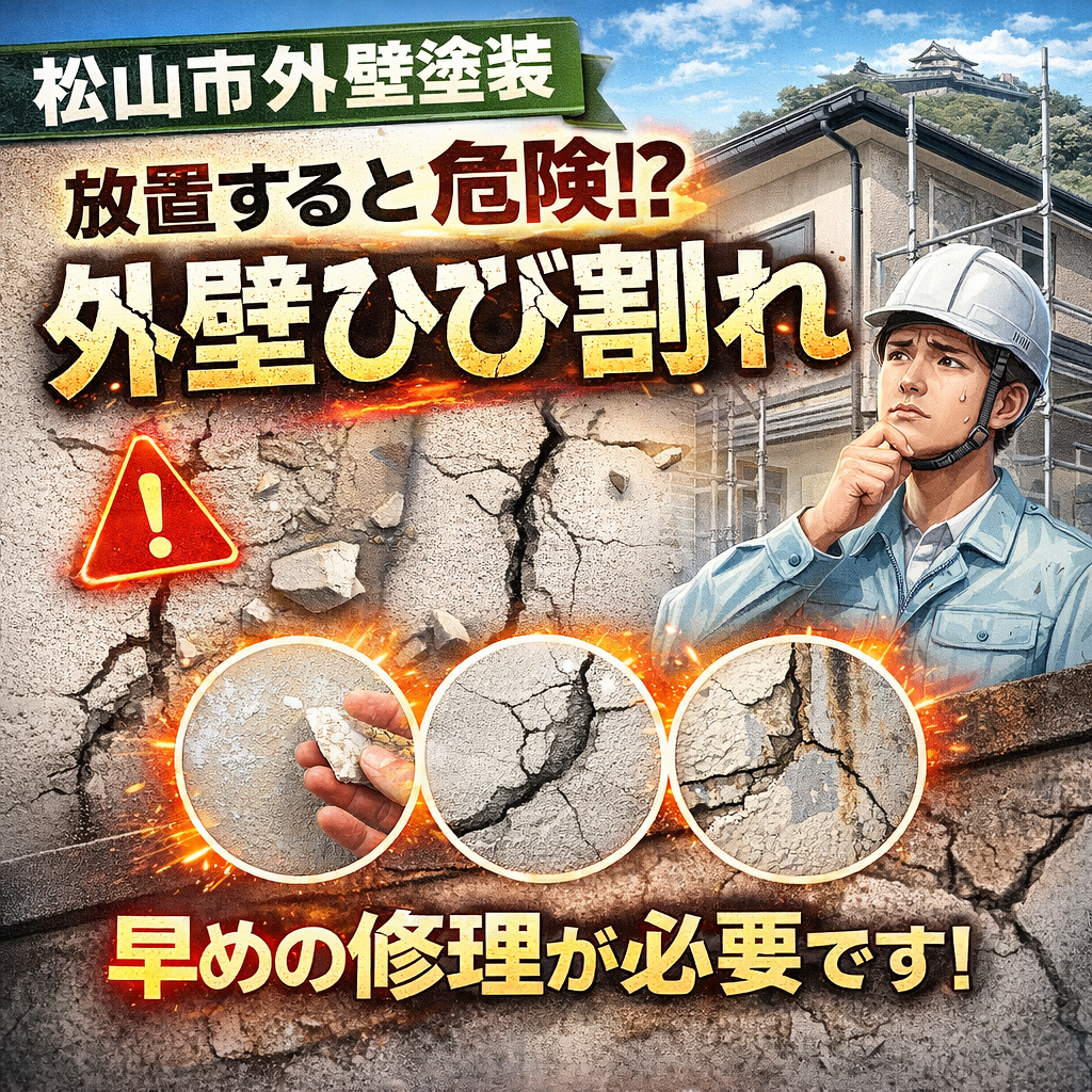 松山市周辺では、紫外線、台風、温度差、湿気の影響に加え、築年数の経過によって塗膜やコーキングが弱り、そこからひび割れが目立ってくるケースも少なくありません。だからこそ、ひび割れは種類ごとに危険度を分けて判断することが大切です。