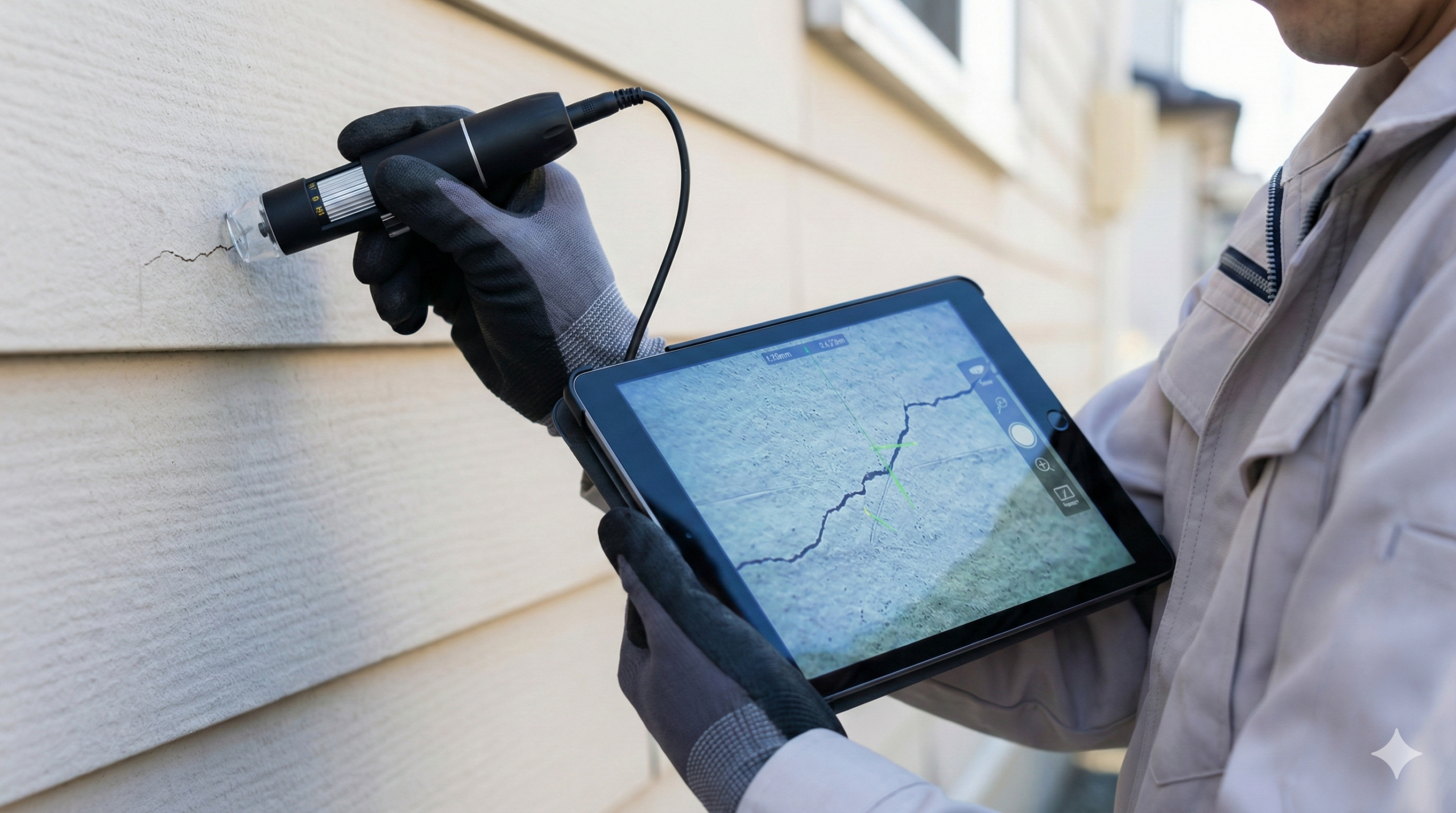 また、「マイクロスコープ(超小型カメラ)」を活用して、肉眼では見逃してしまうような0.1ミリ単位の微小なヘアークラックや、塗膜の浮き・剥離の兆候を拡大観察し、劣化の初期段階を逃さず捉えます。