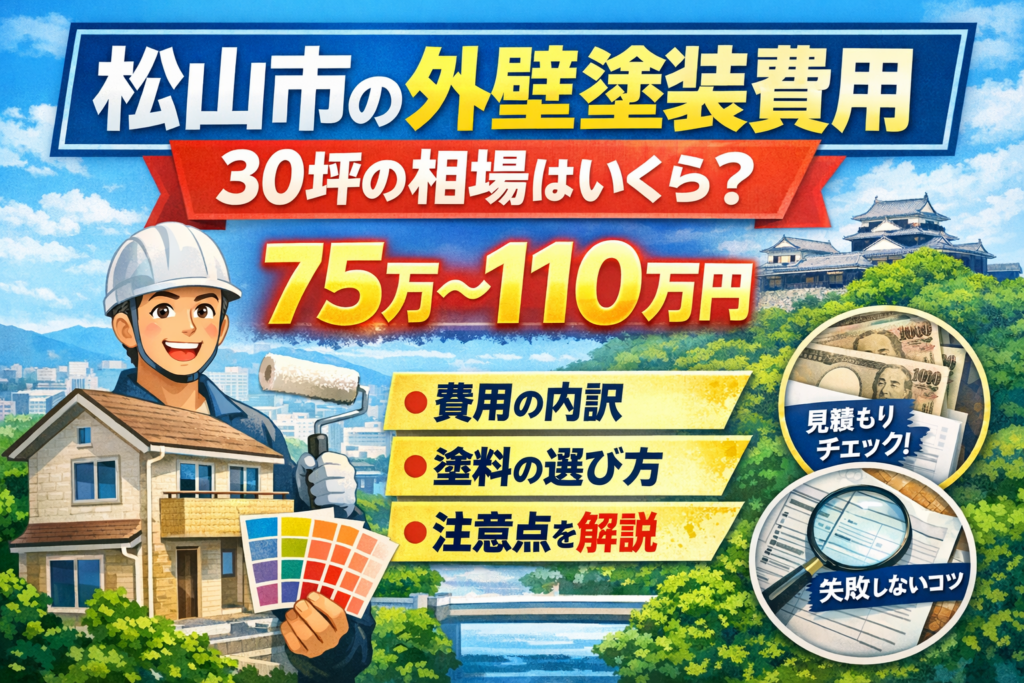 結論から言うと、松山市で30坪の外壁塗装費用は、75万〜110万円前後がひとつの目安です。ただし、この金額はあくまで目安であり、実際には外壁材・劣化状態・シーリングの量・塗料グレード・付帯部の範囲で大きく変わります。