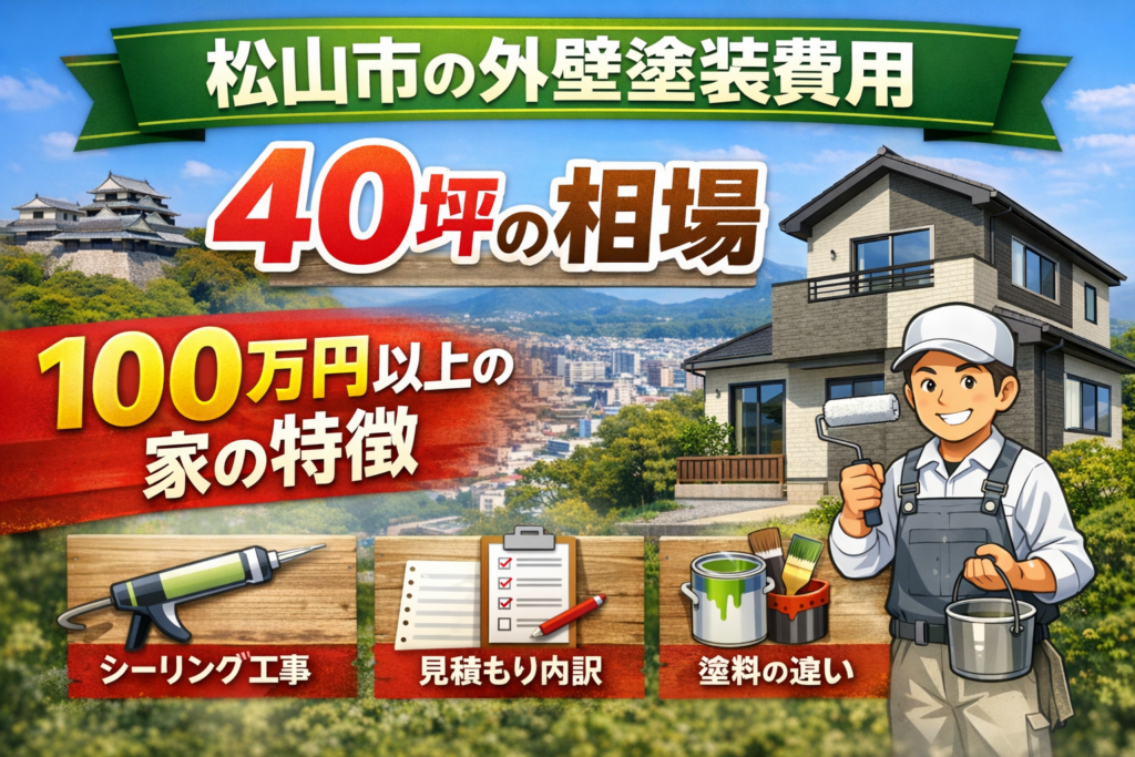 松山市で40坪の外壁塗装費用は、90万〜140万円前後が目安です。40坪では、30坪よりも外壁面積・付帯部・シーリング量・補修量が増えやすく、見積もり差も広がりやすくなります。