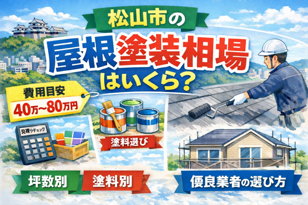 松山市で屋根塗装を検討している方へ。この記事では、松山市の屋根塗装相場の目安、塗料別価格、屋根材ごとの違い、見積もりの注意点、優良業者の選び方まで分かりやすく解説します。相場を知ってから相談したい方、見積もりが高いのか安いのか判断したい方はぜひ参考にしてください。