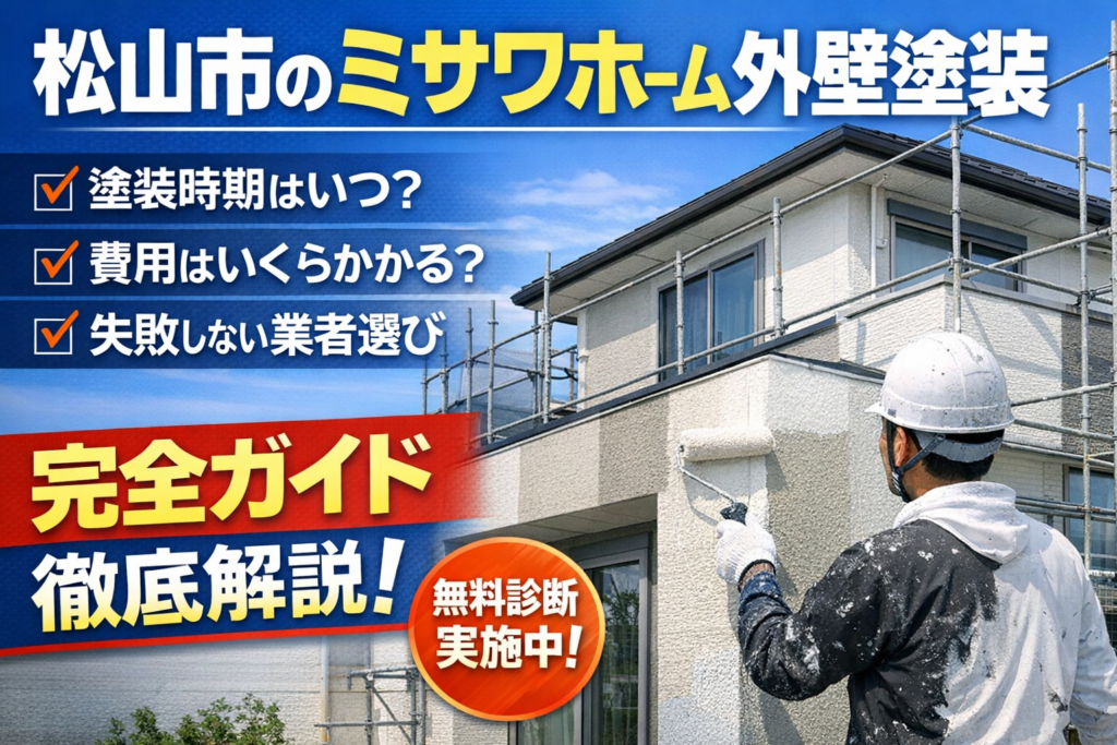 ミサワホームの外壁はいつ塗り替えるべきか。メーカーに依頼するべきか、地元塗装店でも大丈夫なのか。松山市でミサワホーム住宅の外壁塗装を検討中の方に向けて、塗装時期・費用相場・業者選び・失敗しない判断基準まで、現場目線で分かりやすくまとめました。
