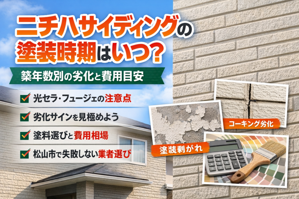 この記事では、ニチハサイディングの代表シリーズ、築年数ごとの劣化傾向、塗装が必要になるタイミング、塗料選び、施工時の注意点、費用相場、見積もりチェックポイント、松山市での業者選びまでをまとめて解説します。