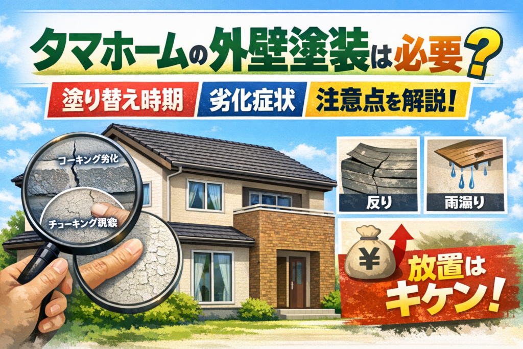 この記事では、タマホーム 外壁塗装タマホーム 塗り替えで検索している方に向けて、必要な理由、塗り替え時期の目安、劣化症状、放置リスク、見積もり時の注意点まで詳しく解説します。