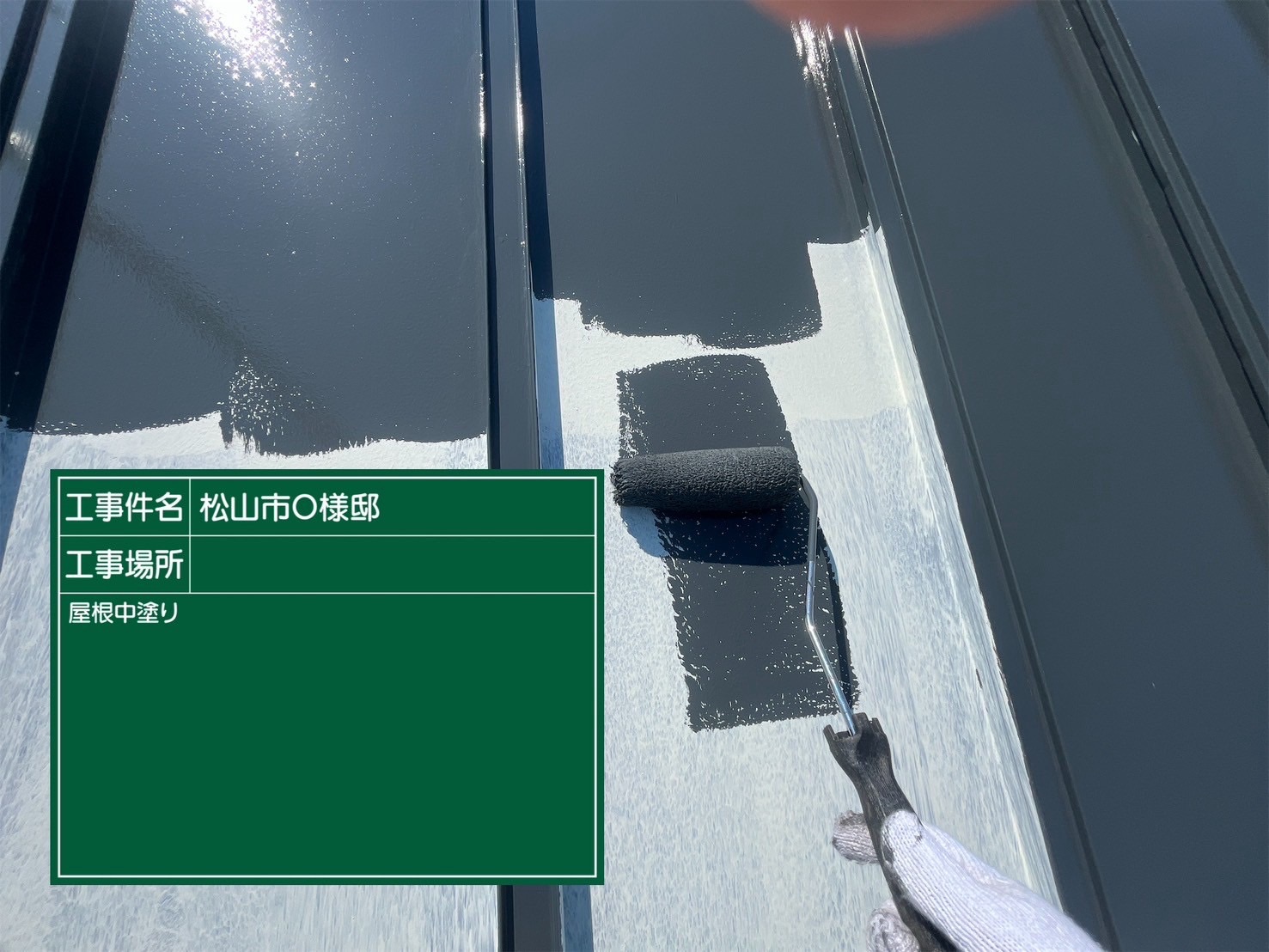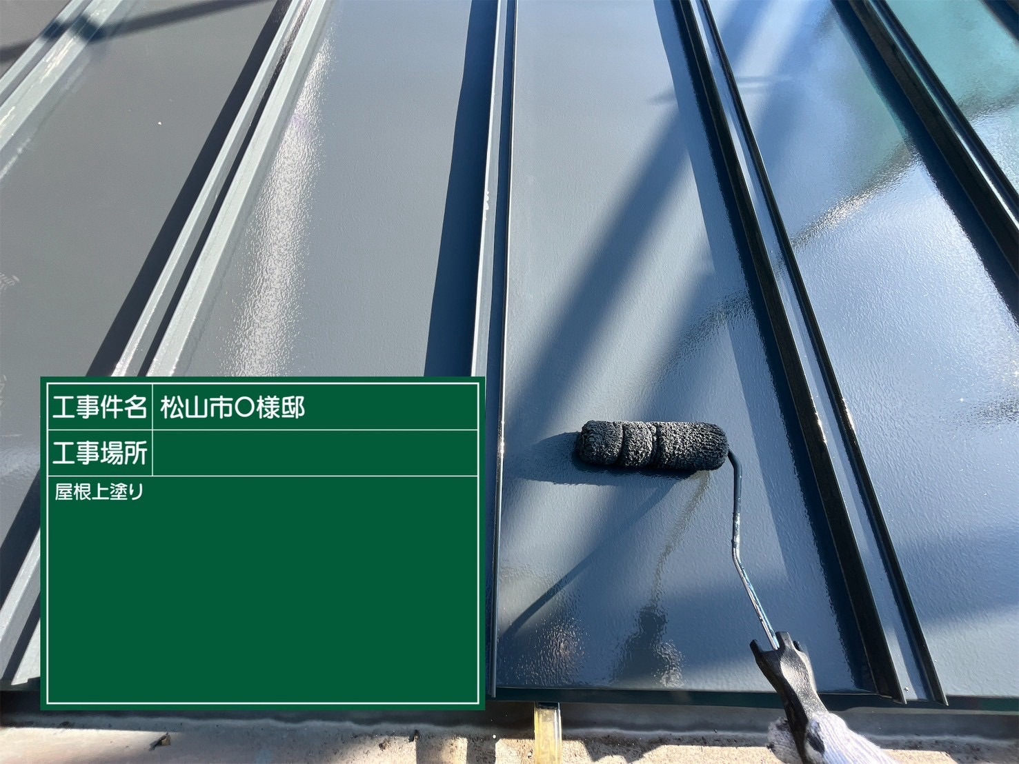 セミフロンスーパールーフⅡを使用し、下塗り→中塗り→上塗りの3工程。熱を反射する遮熱性と、紫外線に強い高耐候性が特長。塗布後は美しい光沢感と耐久性を両立した屋根に仕上がりました。