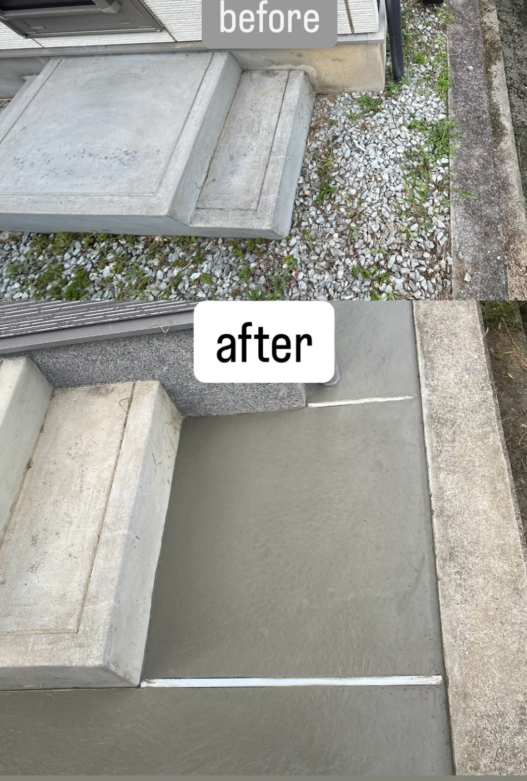 今回は既存撤去をせず、既存土間上に下地処理後、上から補強用モルタルを打設。アプローチが完成しました。