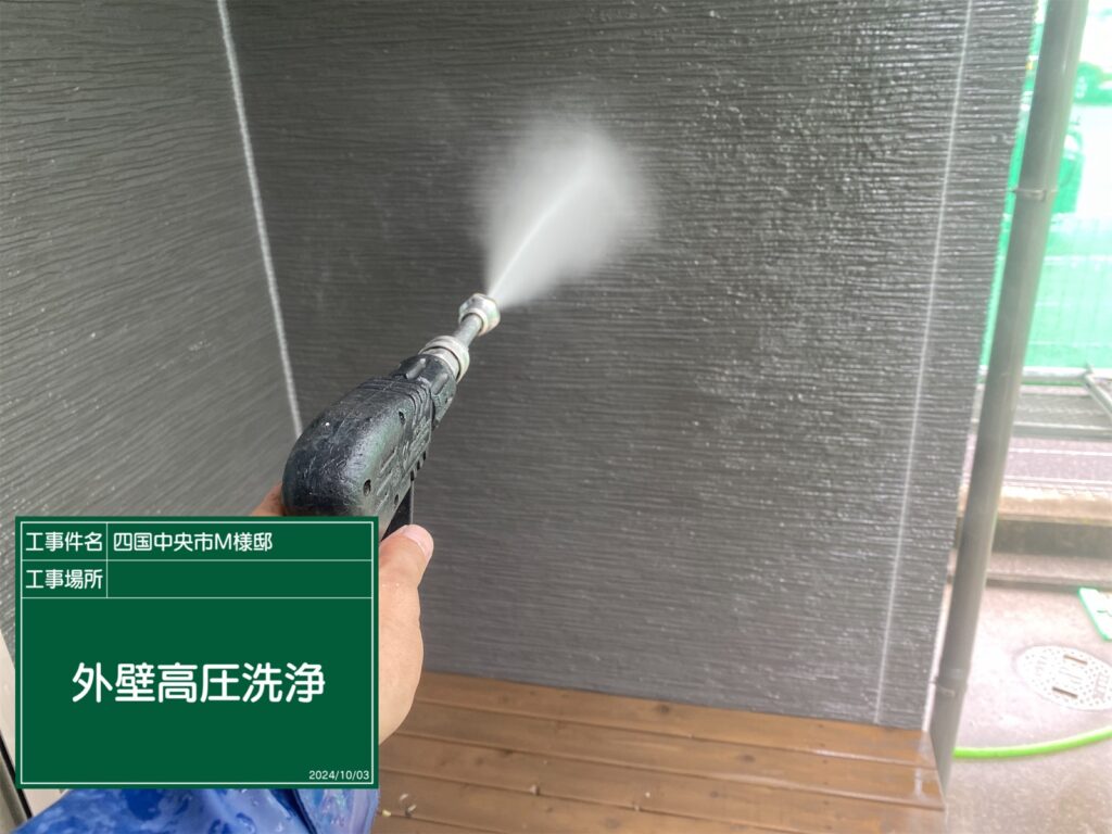 外壁全体を高圧洗浄機で洗い流し、旧塗膜の劣化粉や汚れを徹底除去。