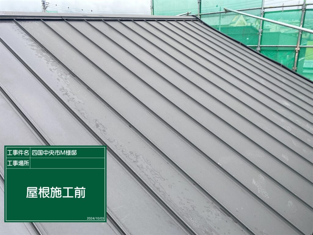 屋根(立平金属屋根)も、表面に汚れや付着物があり、塗装前の下地処理が重要な状態でした。