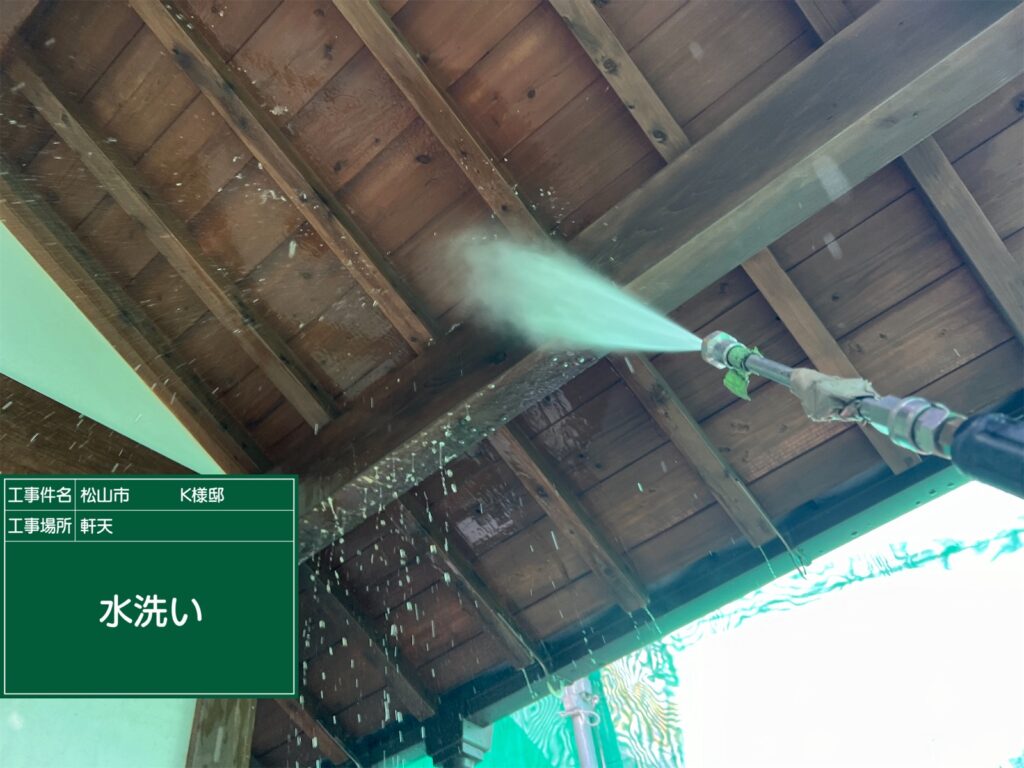 外壁や軒天の汚れ・カビ・ホコリをしっかり洗い流し、塗料が密着しやすい下地を整えました。