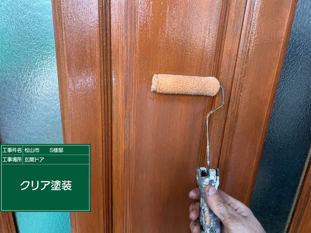 玄関ドアは、木の質感を残すためクリア塗装を採用。